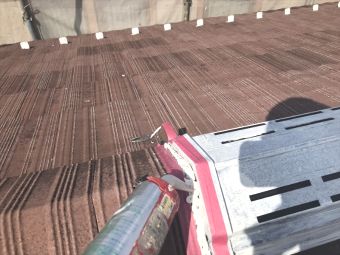 モニエル瓦の表層 スラリー層を固める塗料で作業します。