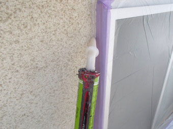 次の工程は、サッシ廻りのコーキング止水。 まず、コーキング用密着プライマーの塗布。