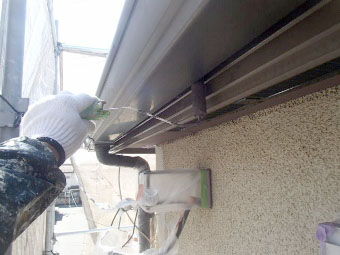 続いて、付帯部の下地調整。 破風板のジョイント部を、コーキング止水。