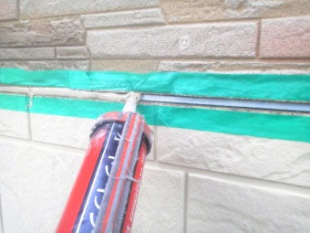 サイディングのアイジャクリ部にコーキングを注入します。 この部分には新築時にコーキングは打たれていません。 (壁の重なり目にシールパッキンがされている為)