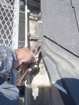 大雨が降ると雨トイを通り越してオーバーフローしてしまうとの事でしたので、谷板金を加工してオーバーフローを抑制しました。